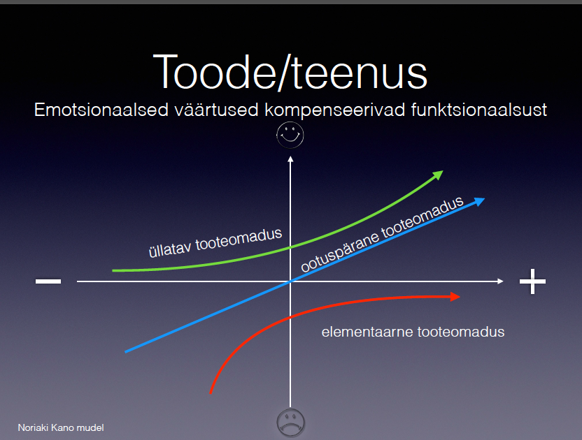 Kujutle, et oled seinakellade tootja, siis mis on sinu toote tarbija elementaarne ootus – mugav ja kiire kellaaja ülevaade, kas pole? Aga mis on ootuspärane tooteomadus – selleks võib olla näiteks, et kell näitaks täpset aega, ütleme eksimus +-1 min aastas. Kui kella seierid on nii peened, et nende nägemiseks peab lähedale minema ja kui kell jääb maha 5 min aastas, siis on väga tõenäoline, et see toode vahetatakse välja parema vastu. Aga kui samal tootel on näiteks üllatavaks tooteomaduseks see, et ta reageerib hämaras liikumisele ja valgustab ruumi just niipalju, et sa varvast vastu lauajalga ära ei löö siis võib see kompenseerida muud puudujäägid. Lisaks demonstreerib ta seda kella meelsasti ka oma sõpradele ja võib isegi varjata selle toote puudujääke. Kui üllatad positiivselt oma kliente, siis muutuvad nad sinu müügiagendiks, tundes seejuures ennast väga hästi.